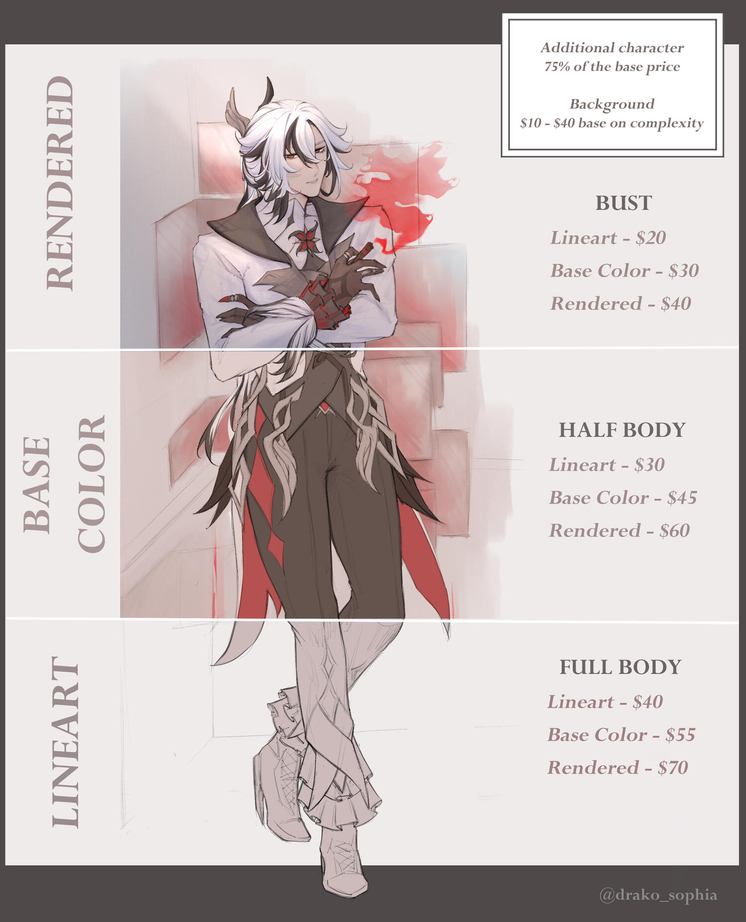 Other Details~ No refunds once I start the piece~I can accept or decline nsfw art commissions~ Send references and sketches, especially if its an OC or a character I'm not familiar with~ Must pay 50% when I finish the final sketch, complete payment after the finished work~ I would update the client every 3 days to see if there's any requests or improvements~ Commission might take 2-4 weeks based on the complexity or my personal schedule (uni)